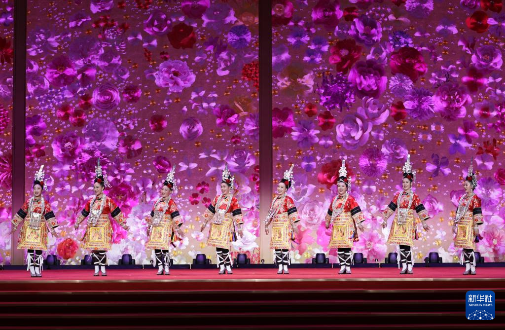 3月6日,演员们在纪念“三八”国际妇女节中外妇女招待会上表演侗族大歌。