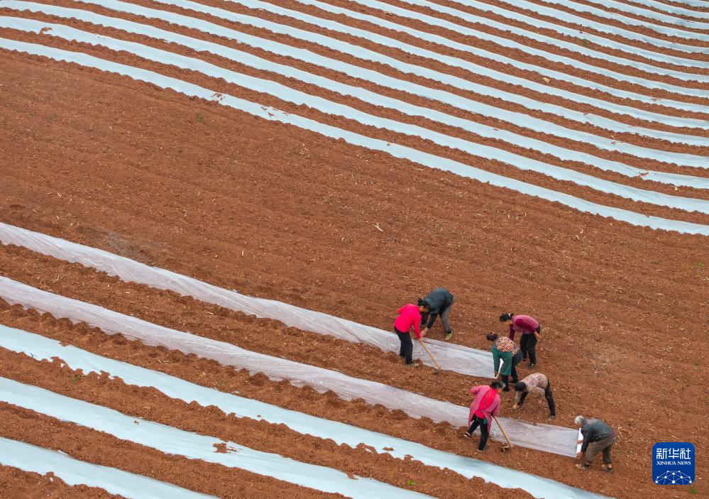 3月6日,村民在天宫庙村覆地膜(无人机照片)。