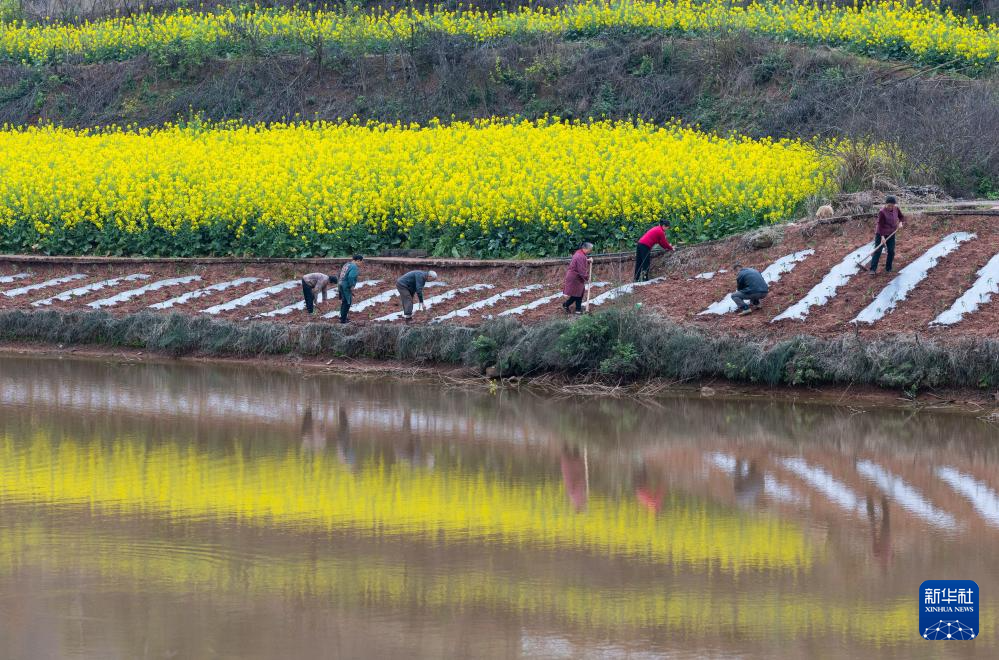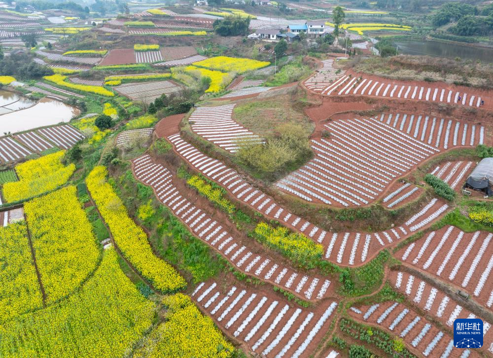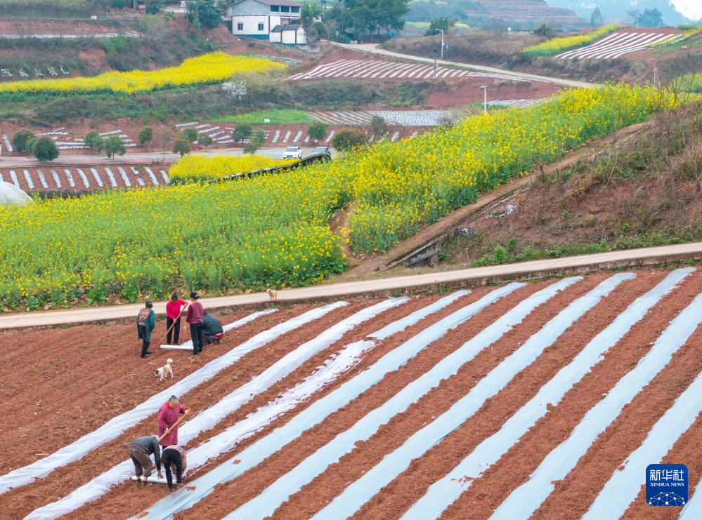 春意渐浓,四川省自贡市荣县乐德镇天宫庙村的村民开始覆地膜、种辣椒等,为春耕做准备。天宫庙村因土壤中富含铁泥质砂岩而呈赭红色,成为远近闻名的“乐德红土地”,赭红色的土壤、金黄的油菜花等形成的不同色块、线条在大地交织,形成大地的“调色板”。