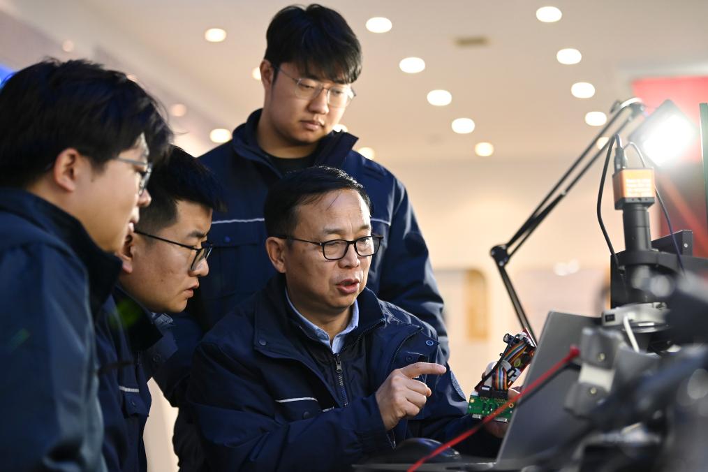 2月13日,在位于山东济南的山东电工电气设备公司工艺实验室,全国人大代表、中国电气装备集团副总经理张帆(左一)主持自粘导线固化特性实验方案讨论。