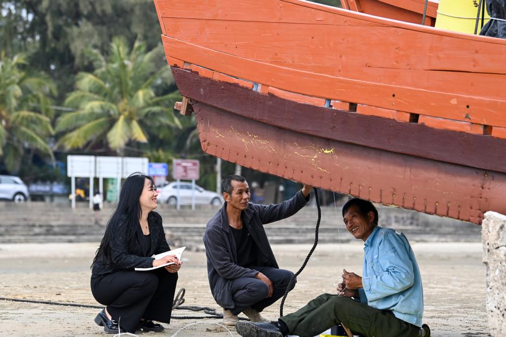 2月7日,在广西东兴市,全国政协委员苏海珍(左)与当地渔民交流。