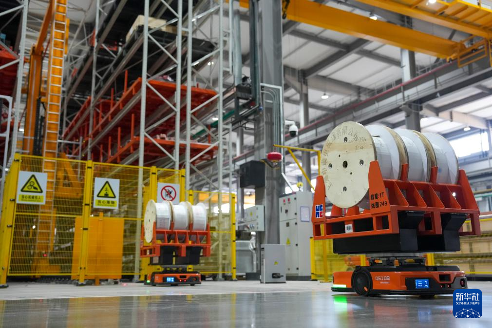 这是3月11日在哈电集团哈尔滨电机厂有限责任公司线圈分厂数字化车间拍摄的正在运行的自动导向搬运车。