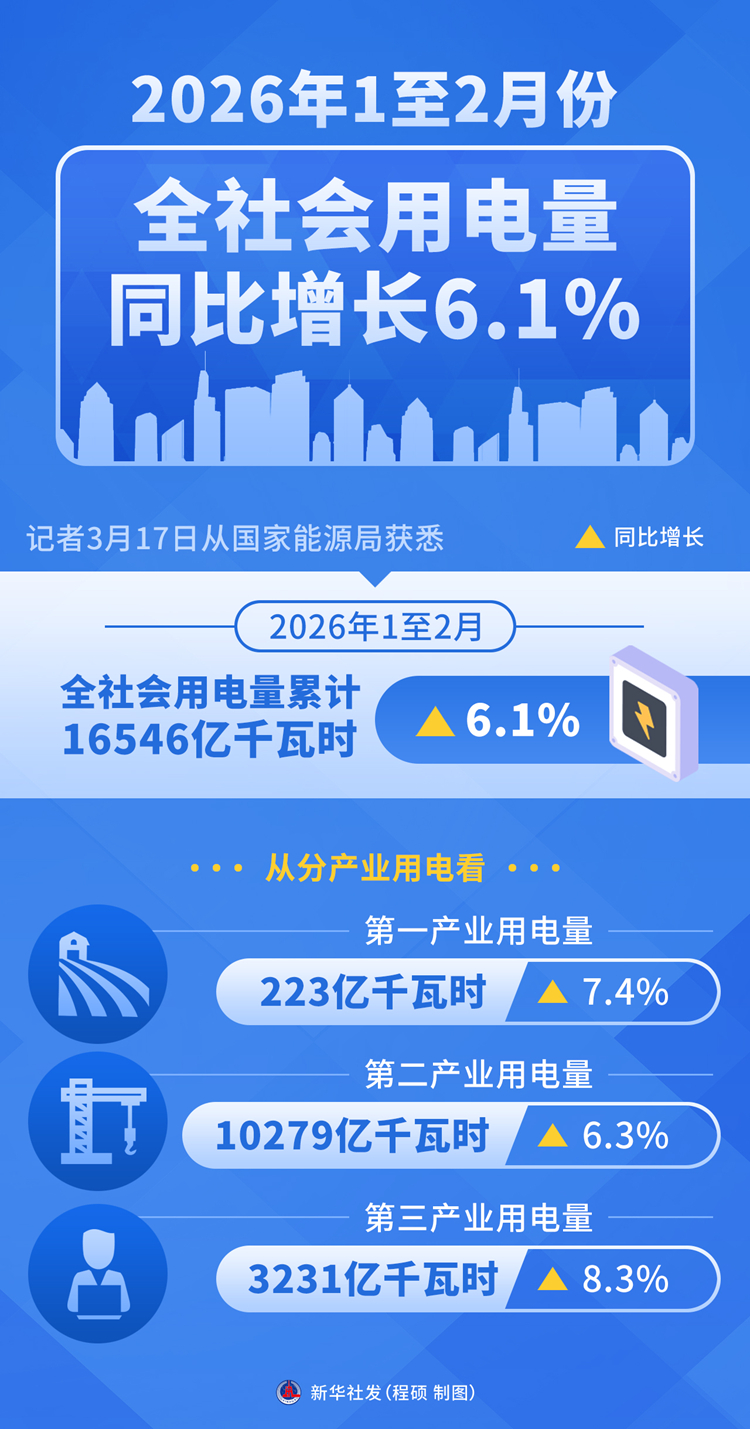 新华社北京3月17日电(记者王悦阳)记者3月17日从国家能源局获悉,2026年1至2月,全社会用电量累计16546亿千瓦时,同比增长6.1%。