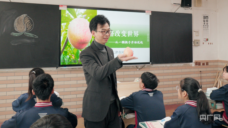 林茂用一颗桃子为道具讲解课程(央广网记者 周思杨 摄)