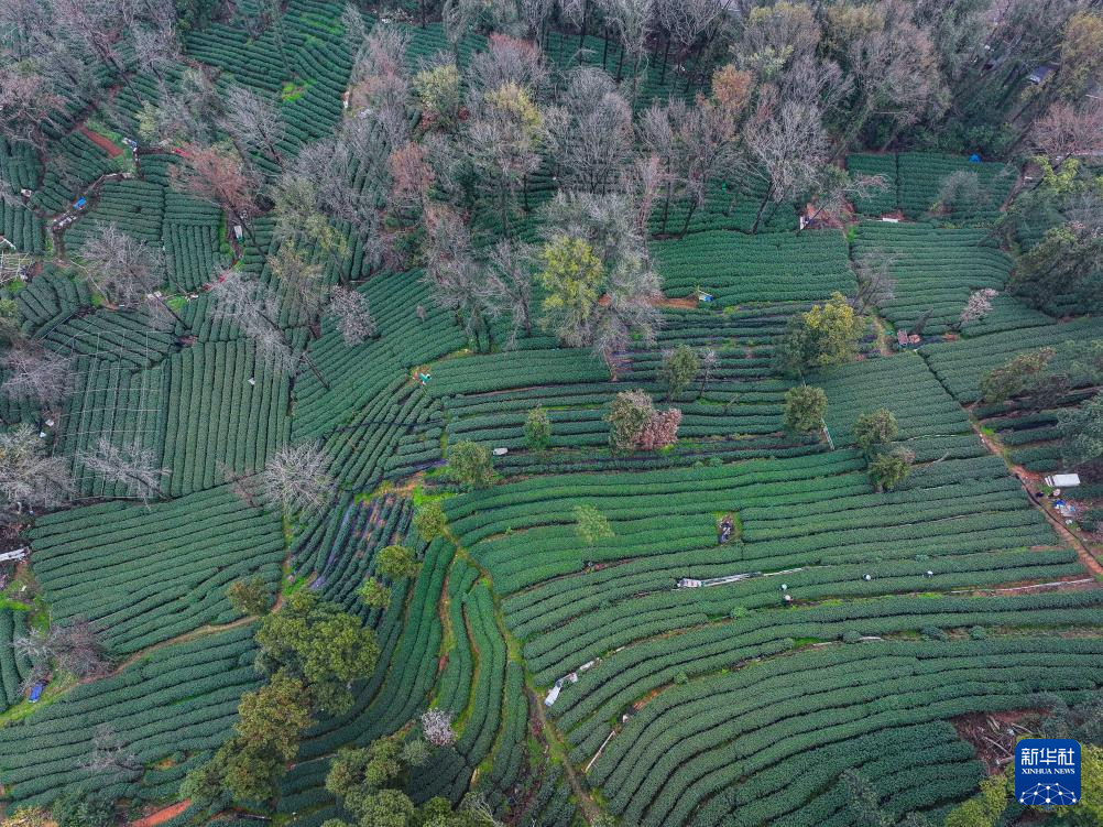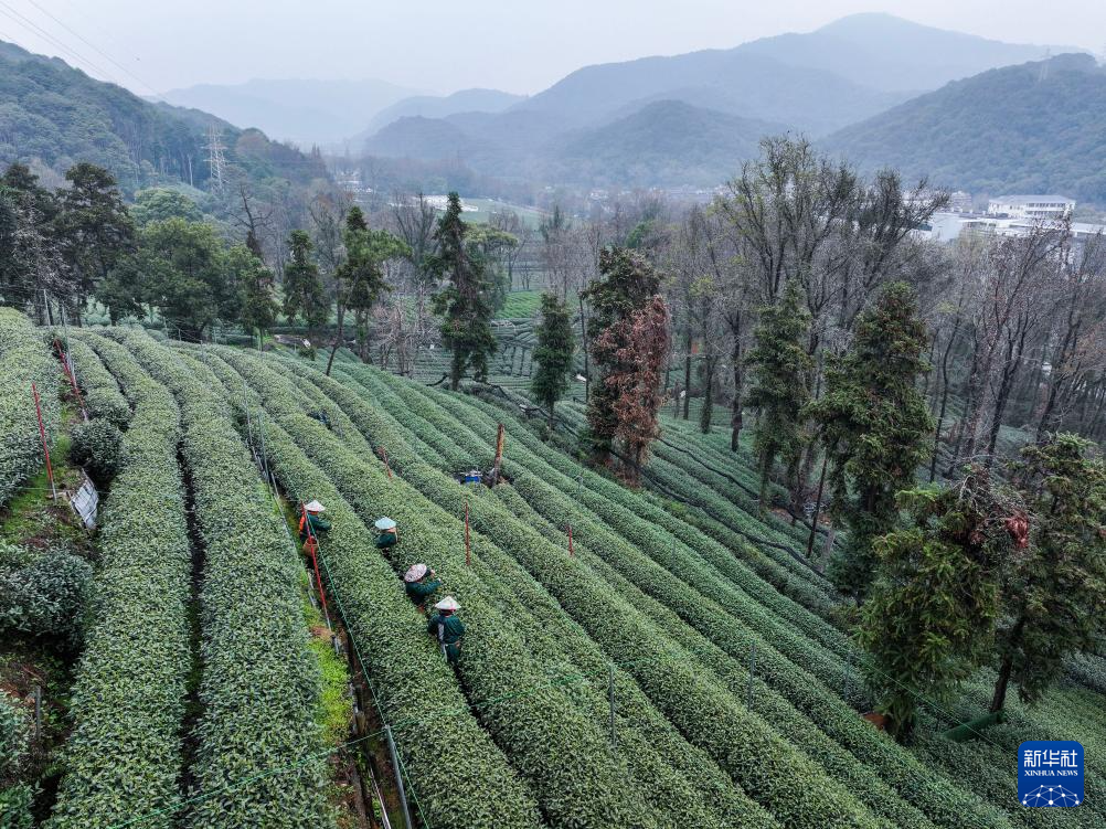 3月19日,梅家坞村的茶农在茶山上采摘西湖龙井“明前茶”(无人机照片)。新华社记者 徐昱 摄