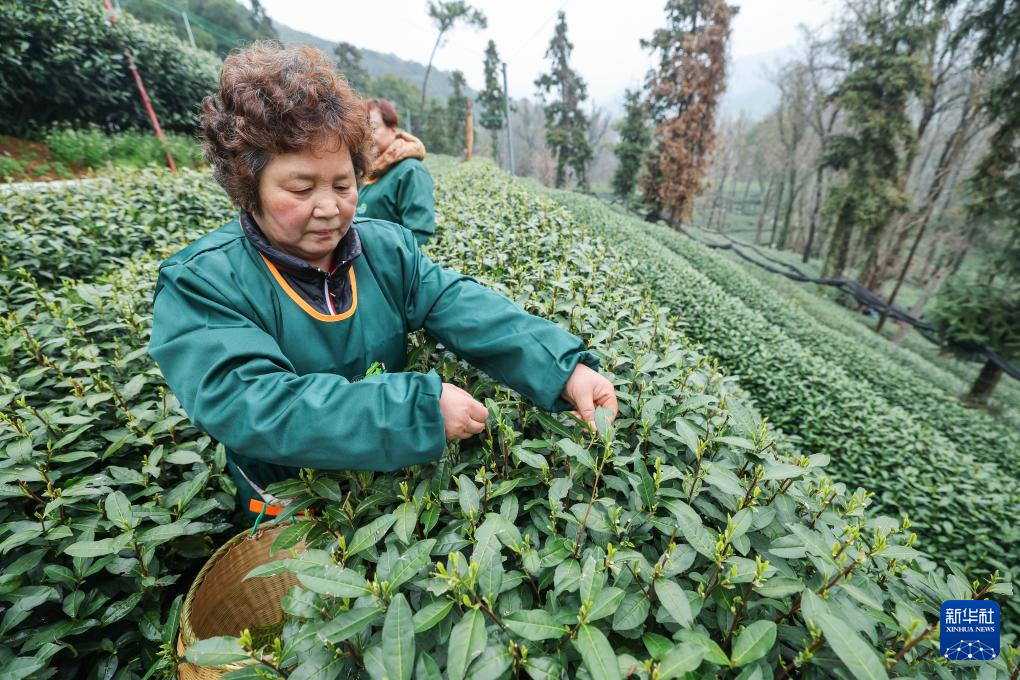 3月19日,西湖龙井茶龙井43品种正式开采,浙江杭州西湖龙井茶一级保护区的梅家坞村、龙井村、翁家山村等产茶区的茶农开始采摘西湖龙井“明前茶”,群体种将于3月下旬开采。据杭州农业部门介绍,今年开春以来,气温回升、雨水增多、光照充足,茶树加快吸收养分、内含物质积累丰富,3月中下旬温度、光照、水分适配,有利于茶芽的生长和采摘加工。新华社记者 徐昱 摄