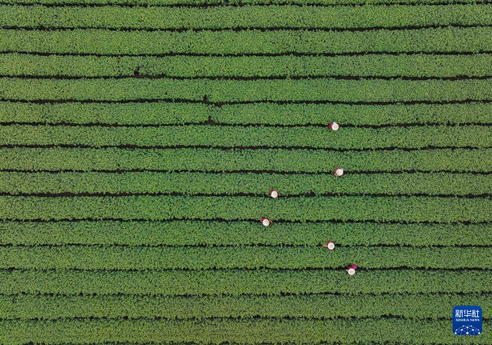 3月19日,梅家坞村的茶农在采摘西湖龙井“明前茶”(无人机照片)。新华社记者 徐昱 摄