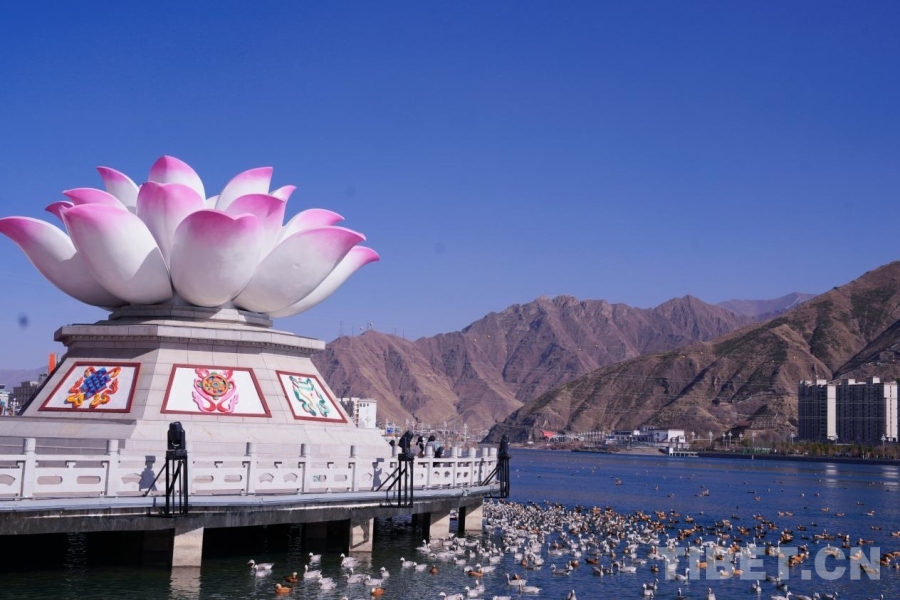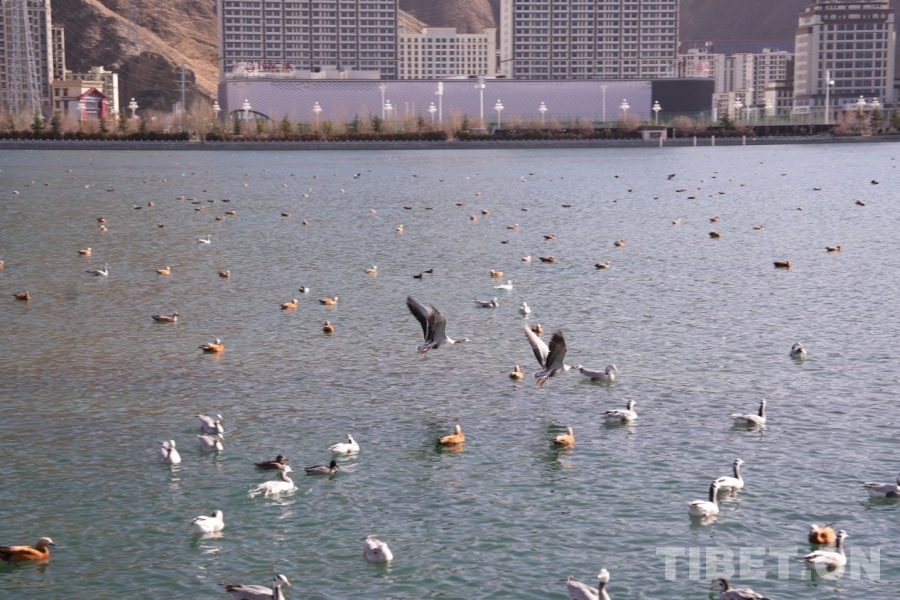 现代化的城市楼宇与连绵的群山相依,成群的斑头雁、赤麻鸭在拉萨河中游弋,勾勒出人与自然和谐共生的高原图景。摄影:张艺彤
