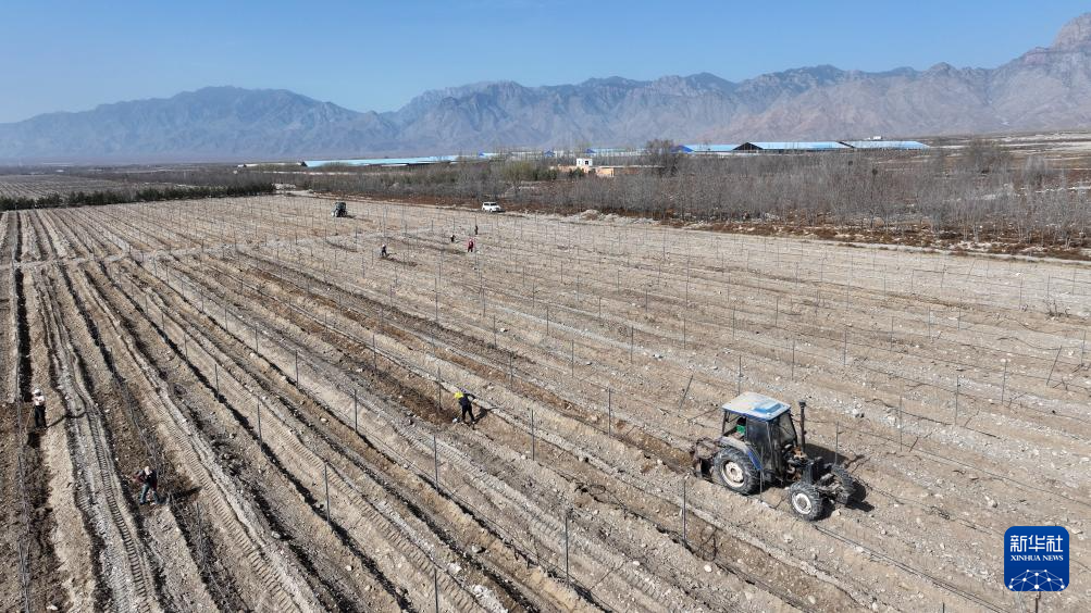 3月23日,工人在贺兰山东麓酿酒葡萄种植基地为葡萄展藤、培土(无人机照片)。