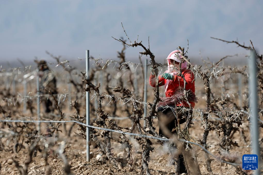 3月23日,工人在贺兰山东麓酿酒葡萄种植基地为葡萄展藤。
