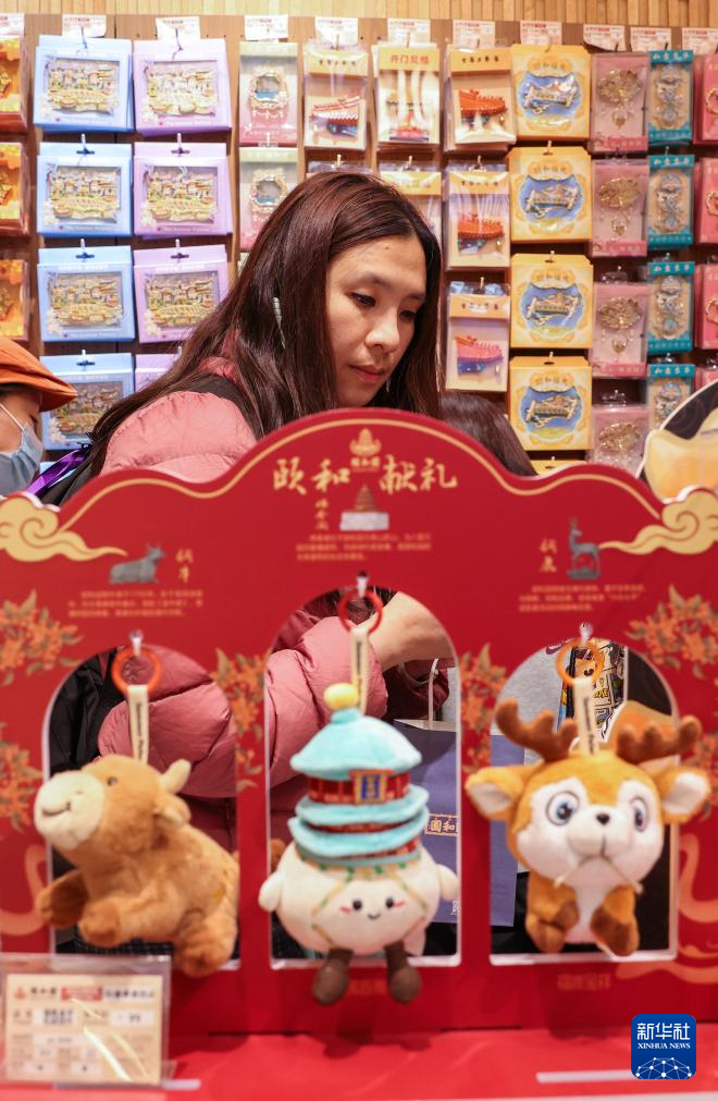 3月23日,游客在北京玉渊潭公园内的一家文创店选购文创产品。