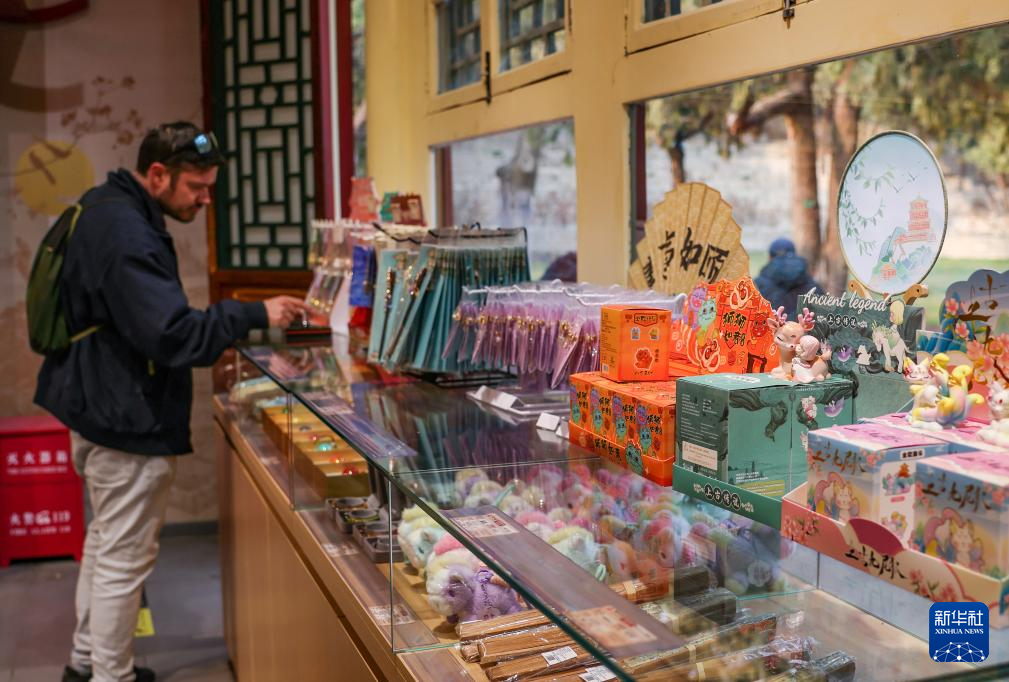 3月23日,游客走过颐和园的文创商品店。