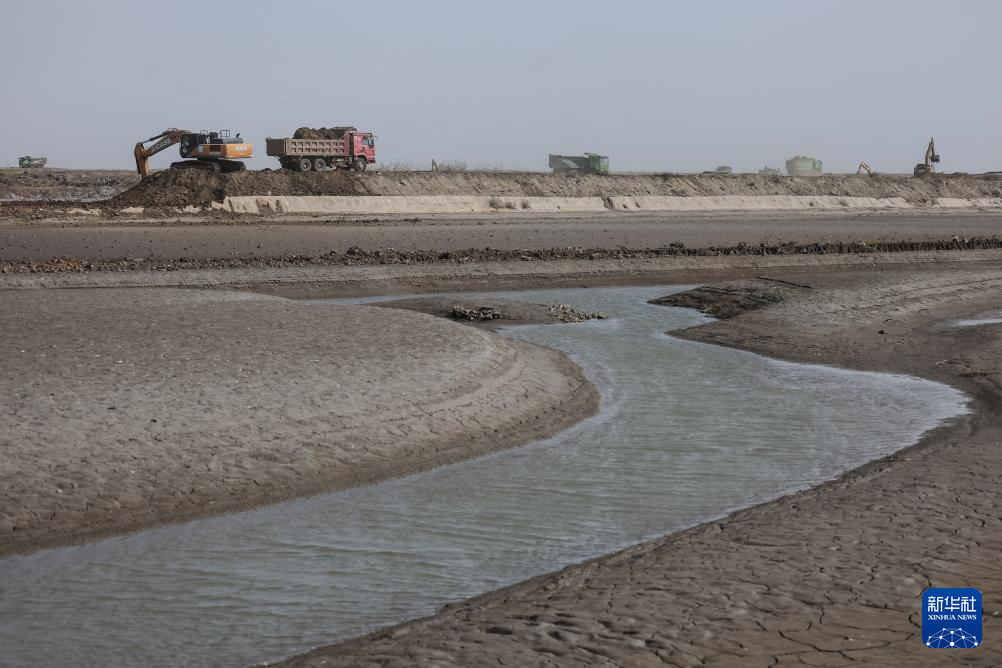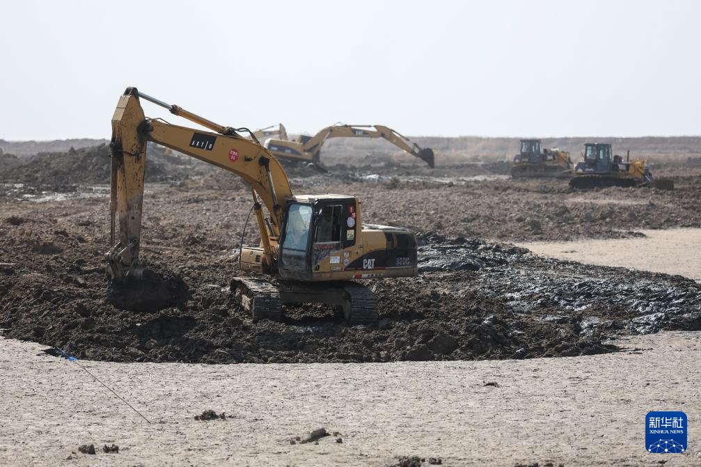 4月1日,大型机械在湿地修复工作现场作业(无人机照片)。