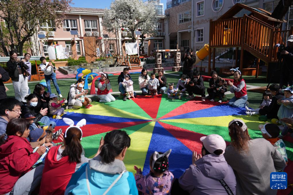 4月1日,在北京市第五幼儿园亲子托育活动现场,家长和孩子在老师引导下参加户外活动。