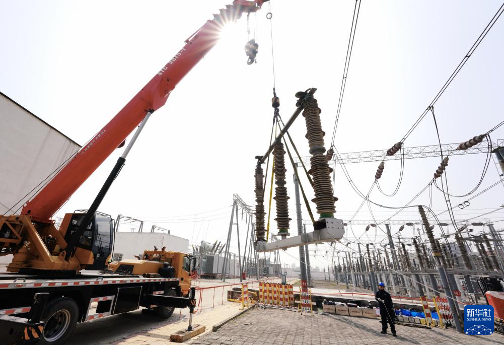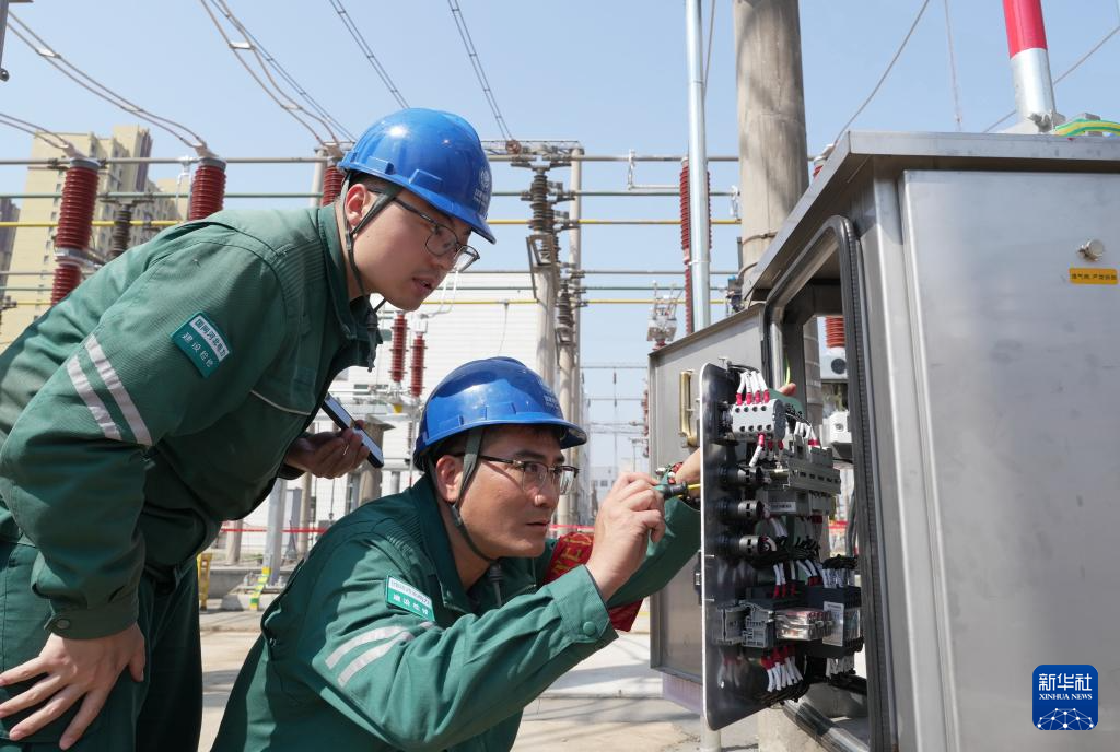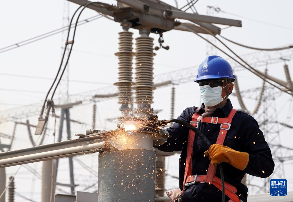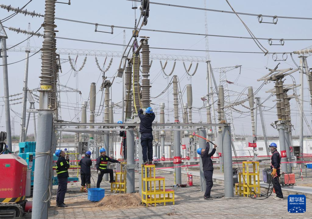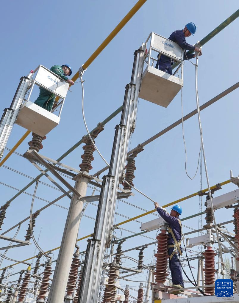 4月1日,国网邢台供电公司的工人在辖区220千伏羊范变电站检修现场工作。