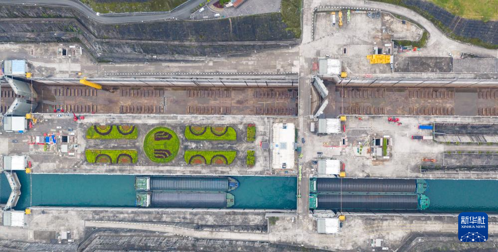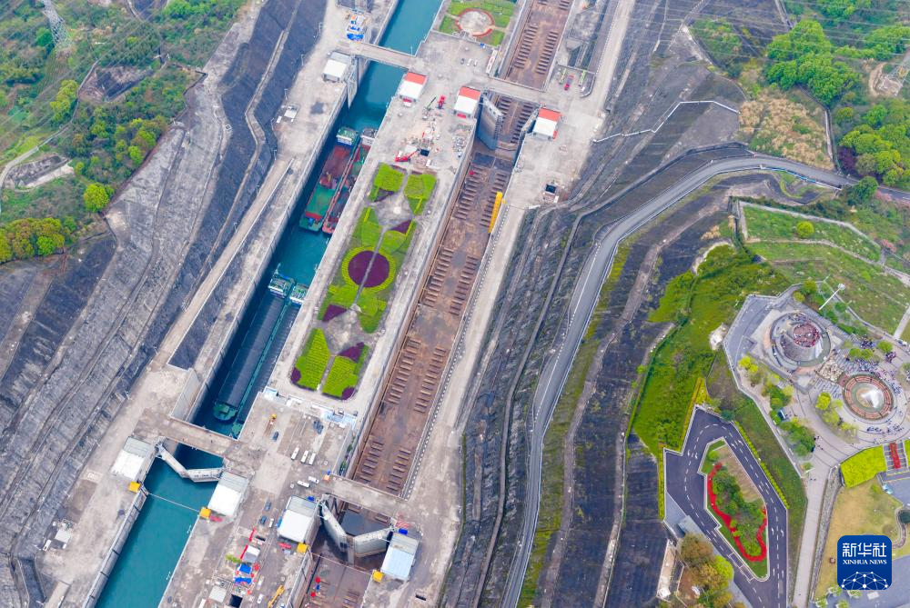 4月2日,三峡枢纽南线船闸加紧检修,北线船闸有序通航(无人机照片)。