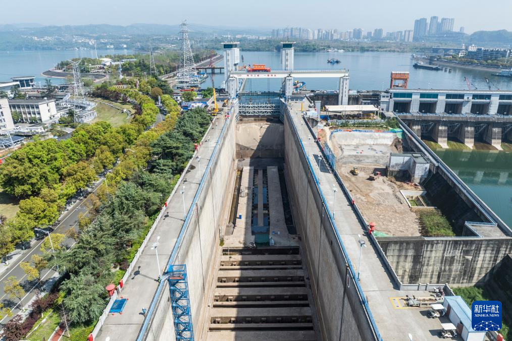 4月1日拍摄的葛洲坝二号船闸停航检修现场(无人机照片)。