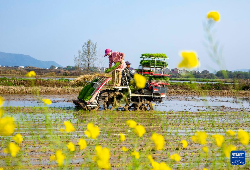 4月1日,江西省九江市都昌县蔡岭镇杨湾村,农民驾驶农机在田间机插早稻。
