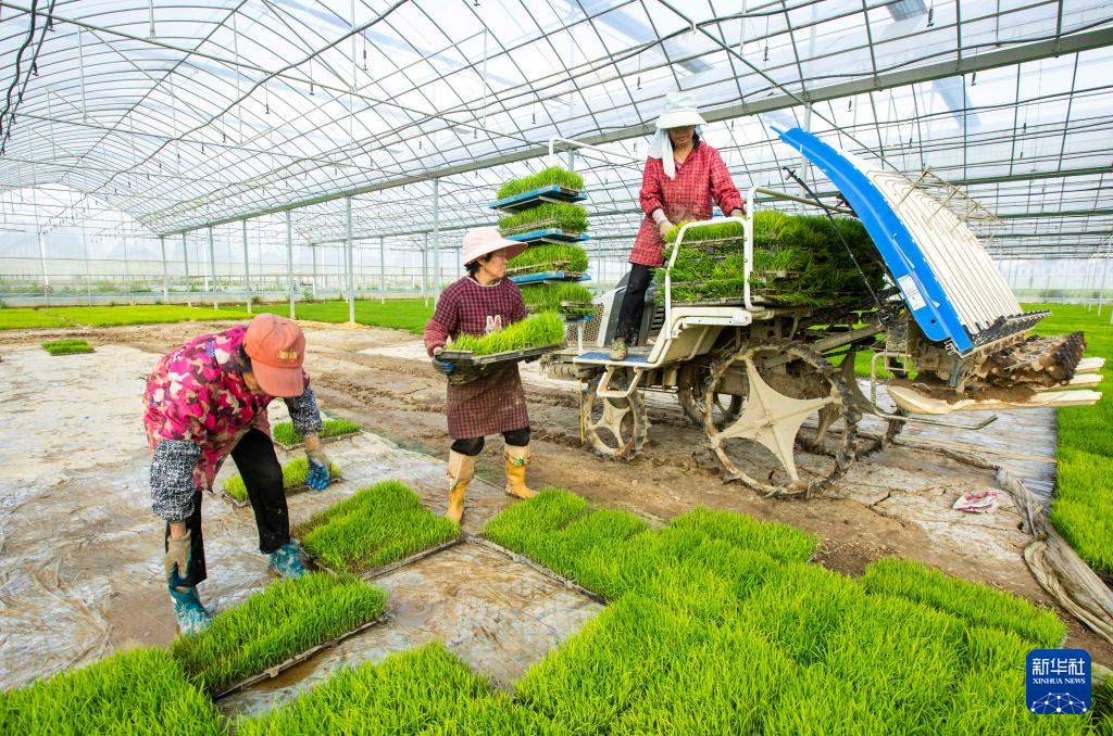 4月1日,农民在江西省九江市都昌县蔡岭镇杨湾村育秧基地起运秧苗,准备机插早稻。