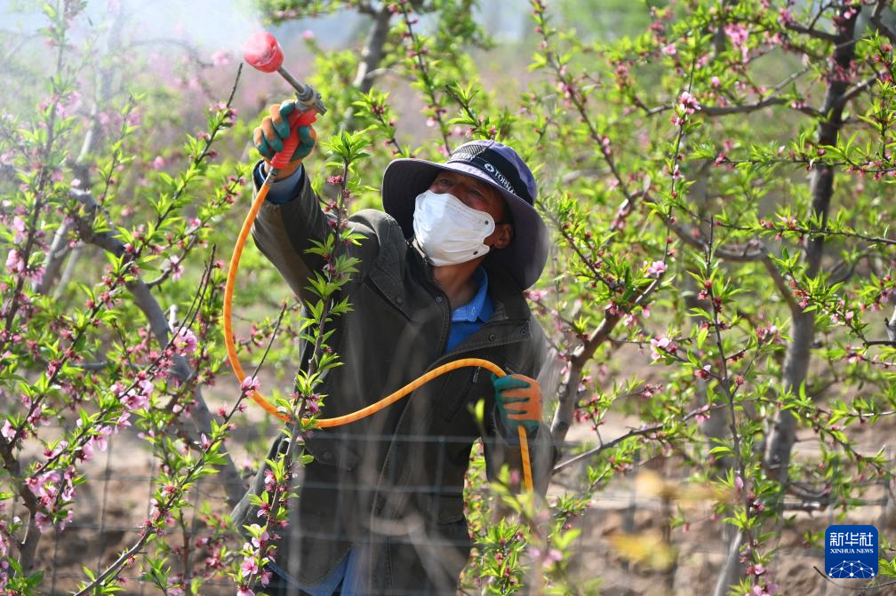 4月2日,河南省开封市城乡一体化示范区杏花营街道榆园村农民在桃园里喷施农药防治病虫害。