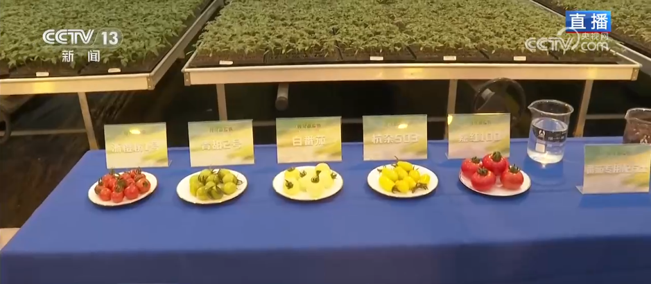 在这里,最惊艳记者的,是这里的番茄。这里有60多个品种的番茄,目前也陆续进入到成熟期。这个叫“浙樱粉”,是常见的小番茄;这个绿色的叫“青甜二号”,工作人员说它在七分熟时酸甜比最好,所以还没变色就能摘了;还有这种白番茄是杂交品种,一般用作化妆品的功能性原料。这个形状特别的长得像花生,也被叫作“花生果”,相对来说更耐高温。这个个头大的,也是草莓番茄里颜色最为深红的一款。