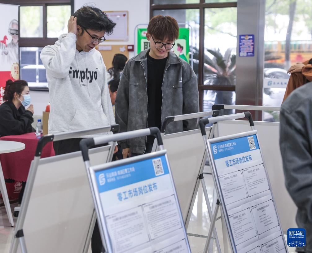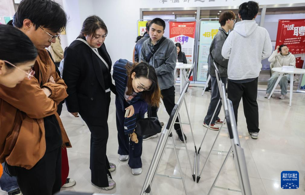 4月9日,求职者在招聘会现场查看招聘信息。