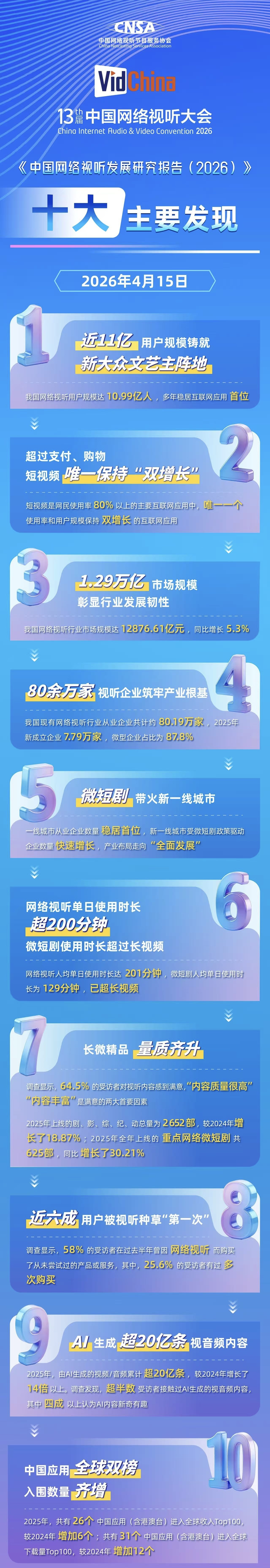 4月15日,第13届中国网络视听大会在四川成都开幕,大会发布《中国网络视听发展研究报告(2026)》显示,截至2025年12月,我国网络视听用户规模达10.99亿人,同比净增776万人, 保持稳步增 态势,彰显了 业极强的发展韧性与对用户的强劲吸引力。在全网互联网应用供给持续丰富,用户注意力竞争趋激烈的环境下,网络视听作为多年稳居首位的互联网应用,已是国内渗透范围最广,覆盖人数最多,链接千行百业和万亿大众的数字服务载体。