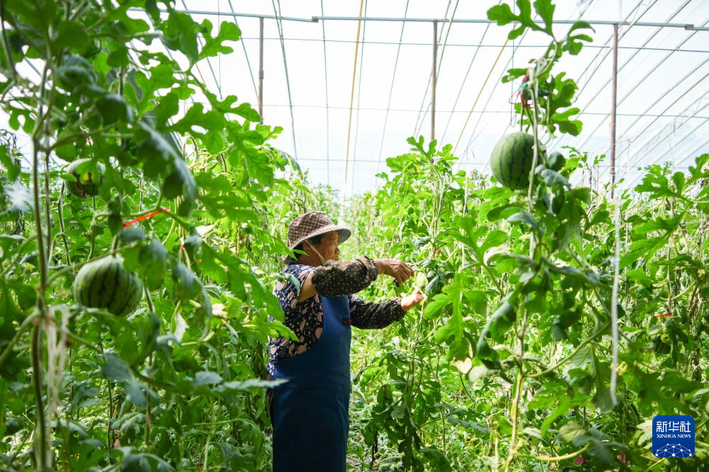 4月17日,在潍坊市昌乐县五图街道,一名瓜农在查看成熟的小型西瓜。