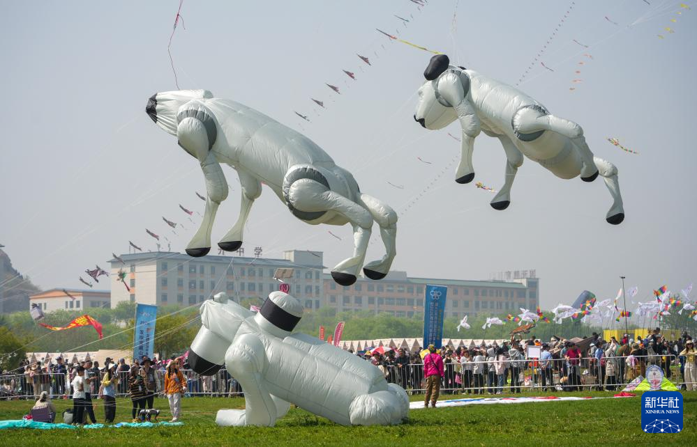 这是4月18日拍摄的第43届潍坊国际风筝会万人风筝放飞活动上的机器狗造型风筝。