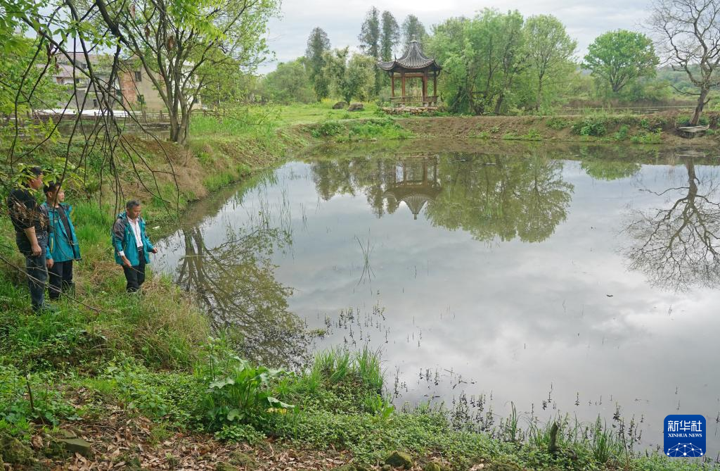 在江西省都昌县达子咀村,村民在投放了小鱼苗的水塘边巡查(4月9日摄)。
