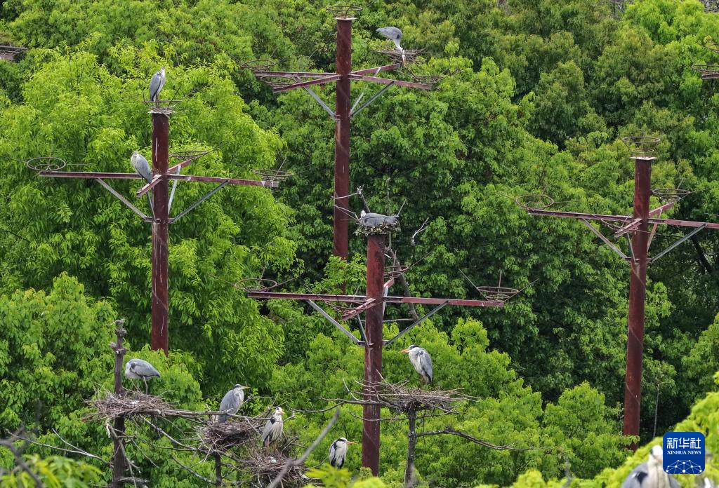 在村民细心守护下,来到这里的苍鹭越来越多,用于筑巢的树木就不够用了。为了方便苍鹭“居住”,2016年,村里众筹资金建起了11个铁制的人工巢架,每棵“铁树”上面都设有5个鸟巢,苍鹭衔来树枝便可在此筑巢栖息,繁育后代。