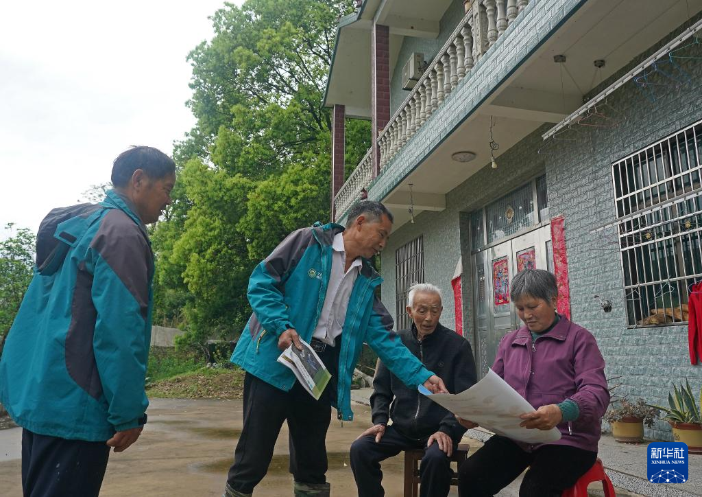 在江西省都昌县达子咀村,村民徐渭水(左二)和徐国松(左一)向其他居民宣传护鸟知识(4月9日摄)。