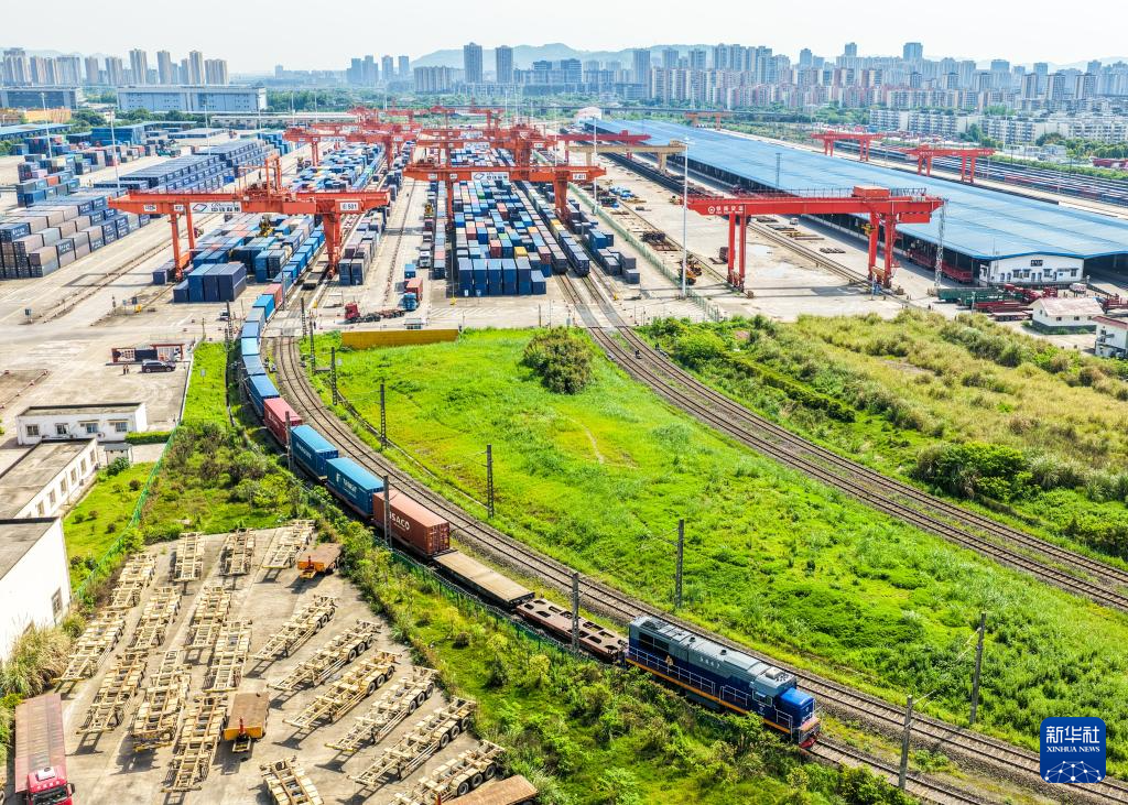 4月23日,一列装载汽车配件、机械机具等货物的中欧班列在重庆团结村站顺利发车(无人机照片)。