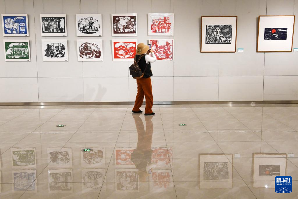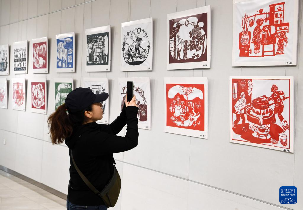4月24日,在锦州文化艺术中心,参观者拍摄“美丽锦州·市民印象”生态主题作品展上展出的剪纸作品。