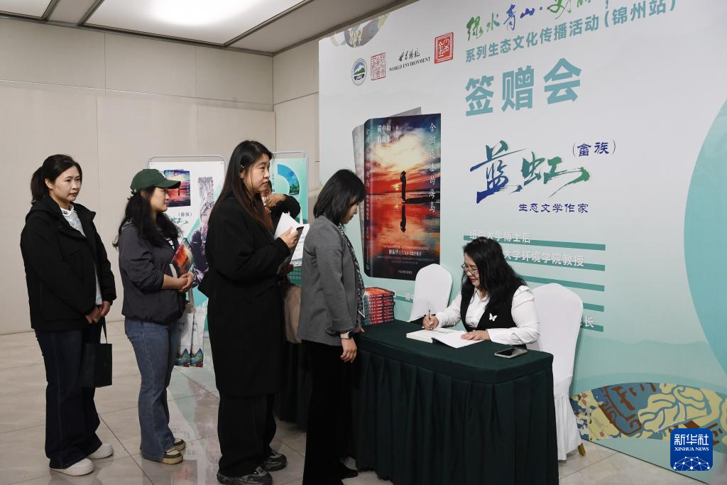 4月24日,在锦州文化艺术中心,中国人民大学环境学院教授、生态文学作家蓝虹为读者签名赠书。