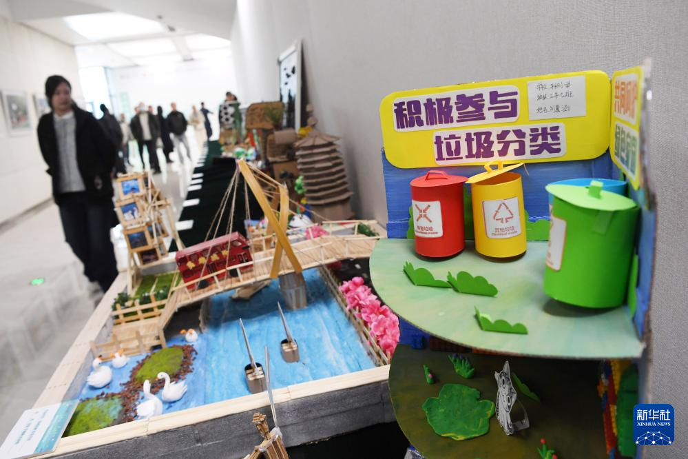 4月24日,在锦州文化艺术中心,参观者观看“美丽锦州·市民印象”生态主题作品展上展出的小学生利用废弃物制作的环保创意作品。