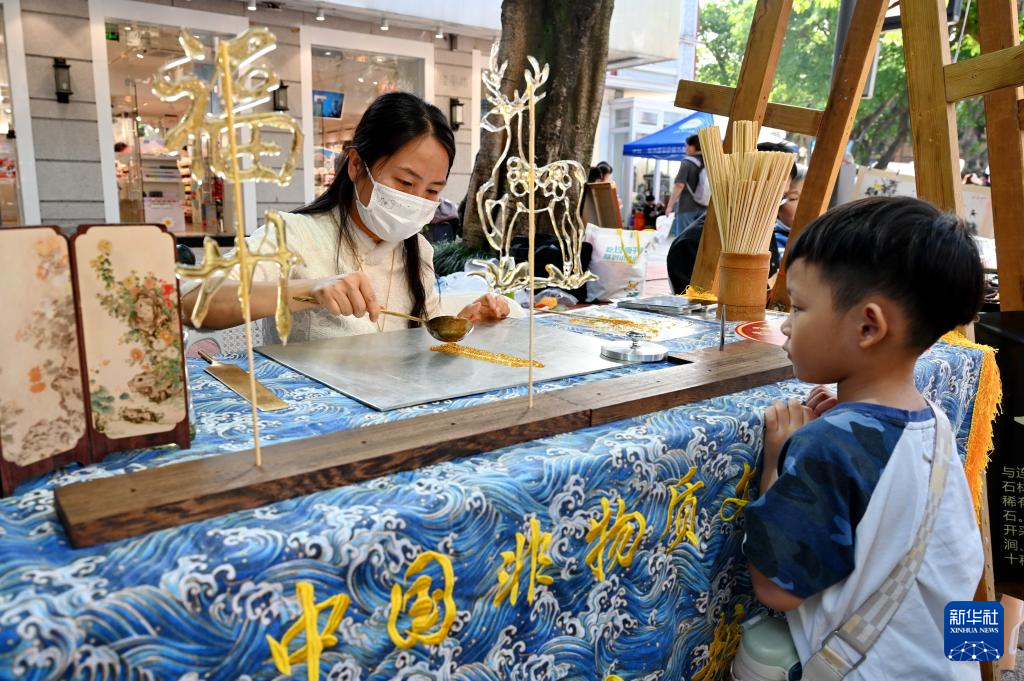 4月25日,小朋友在2026福州“五一”文旅主题活动现场观看糖画技艺展示。