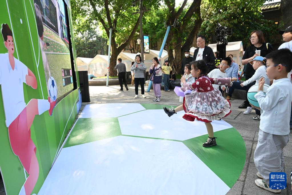 4月25日,小朋友在2026福州“五一”文旅主题活动现场开展数字足球体感互动。