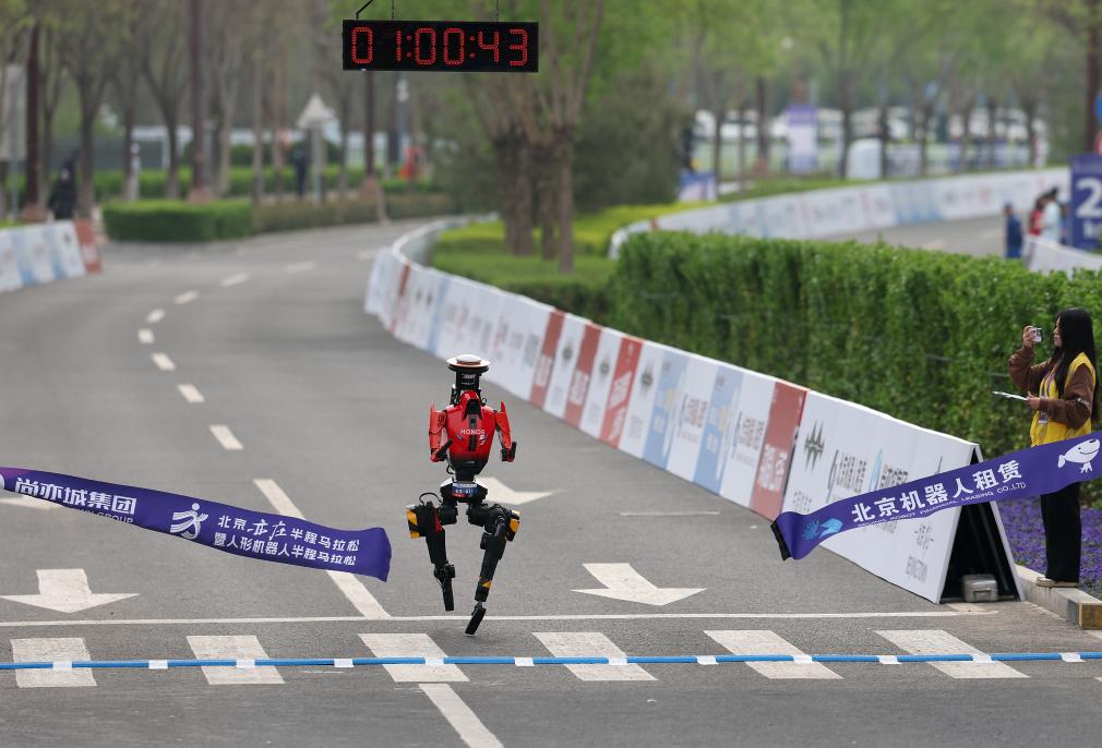 4月19日,雷霆闪电队自主人形机器人选手“闪电”在比赛中冲线。新华社记者 张晨霖 摄