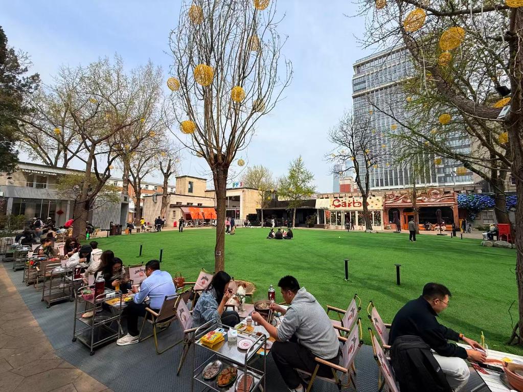 4月2日中午,食客在北京友谊商店室外草坪露天就餐。新华社记者张骁 摄