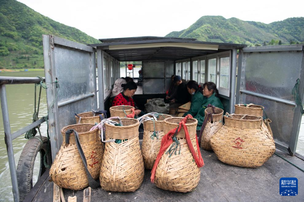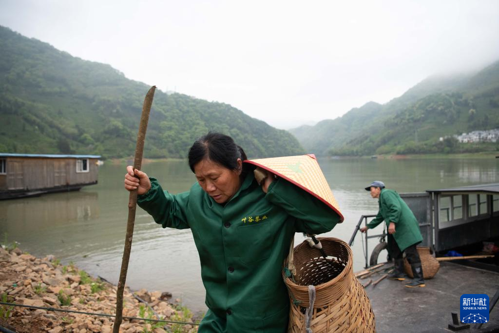 4月24日中午,在黄山市黄山区新明乡猴坑村的码头附近,采茶工准备将制作太平猴魁的鲜叶运到船上。