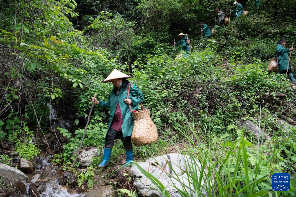 4月24日,在黄山市黄山区新明乡猴坑村,采茶工结束采摘后离开高山茶园。