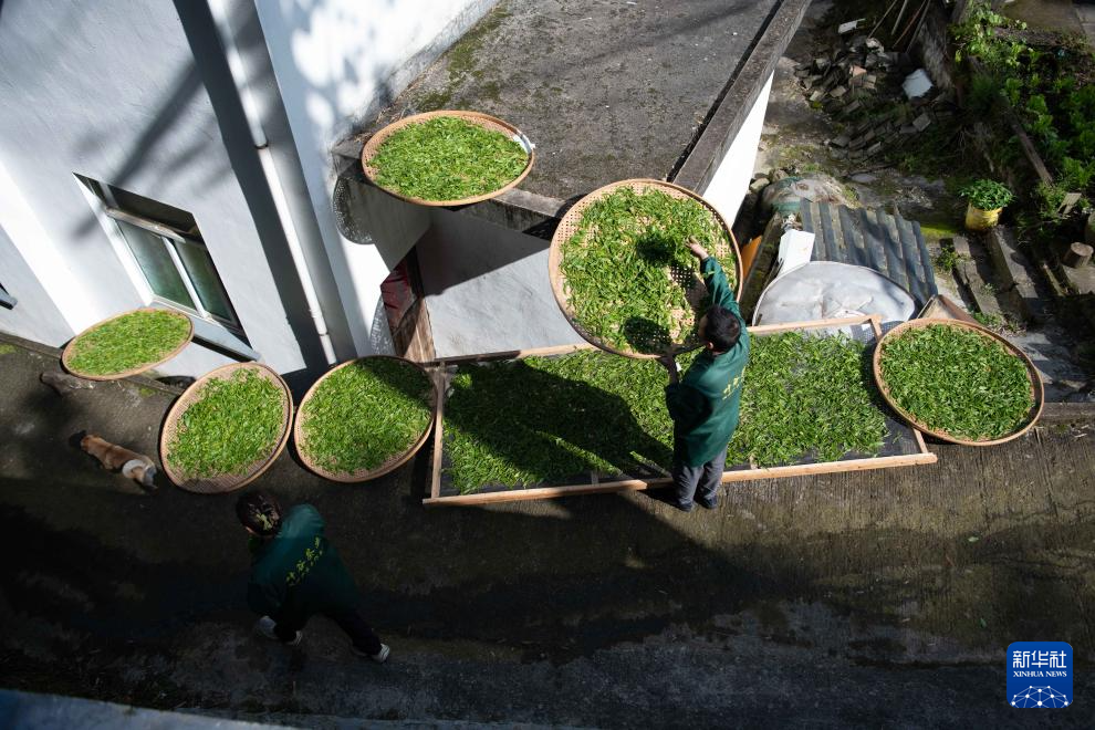 4月25日,在黄山市黄山区新明乡猴坑村中潭村民组,茶农叶鑫建(右)在查看鲜叶的摊放程度。