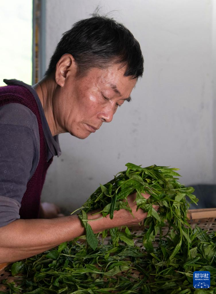 4月25日,在黄山市黄山区新明乡猴坑村中潭村民组,茶农叶良金在查看鲜叶的摊放程度。