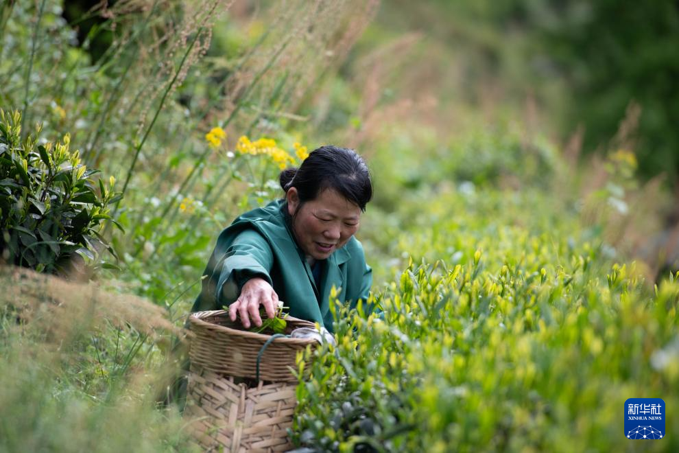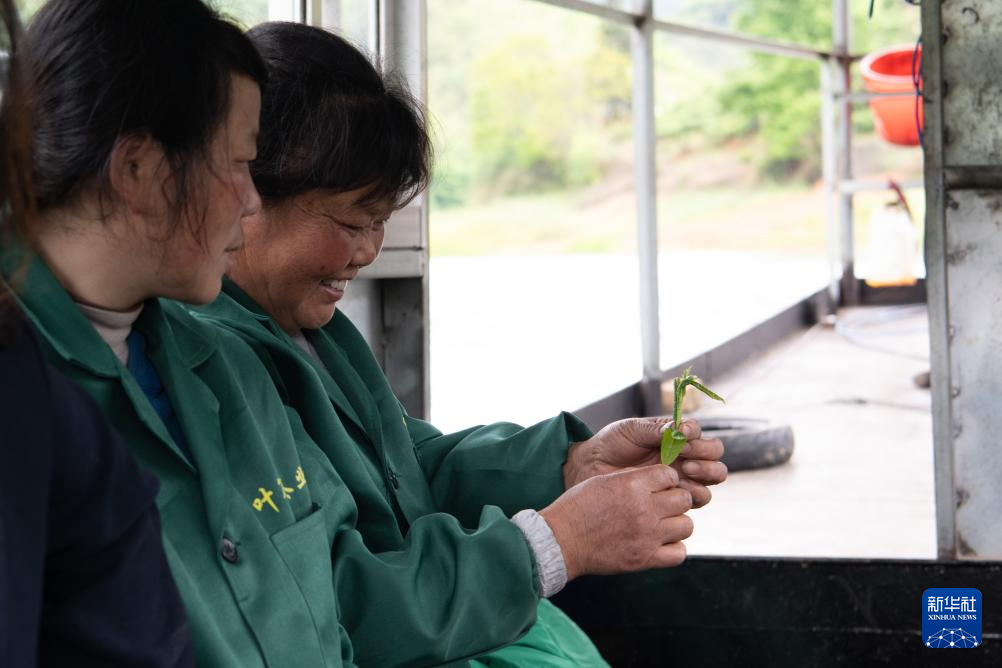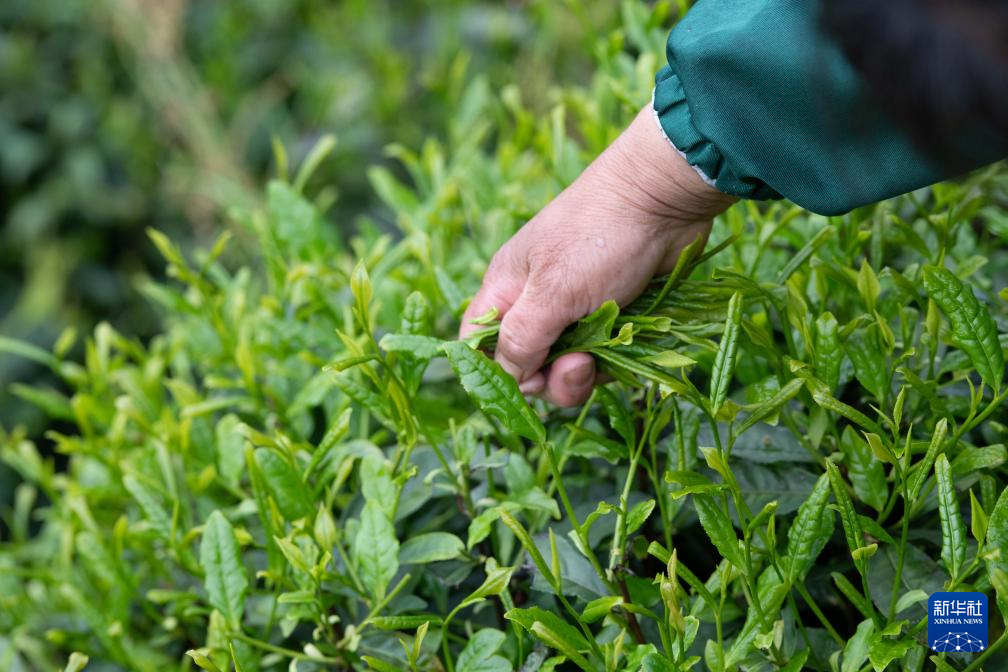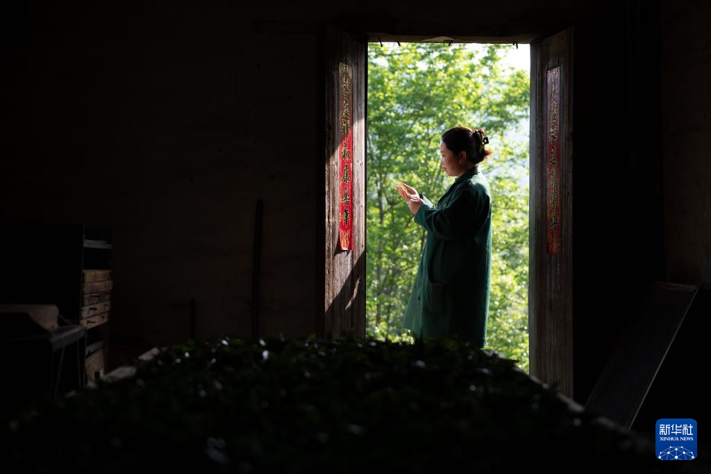 4月25日,在黄山市黄山区新明乡猴坑村中潭村民组,茶农叶萍在查看鲜叶的品质。