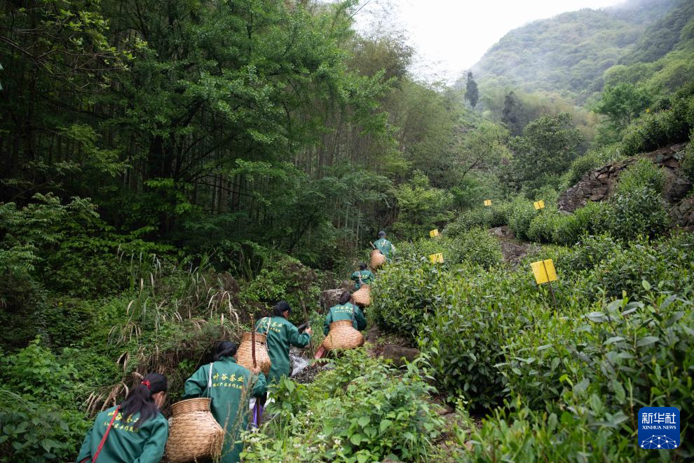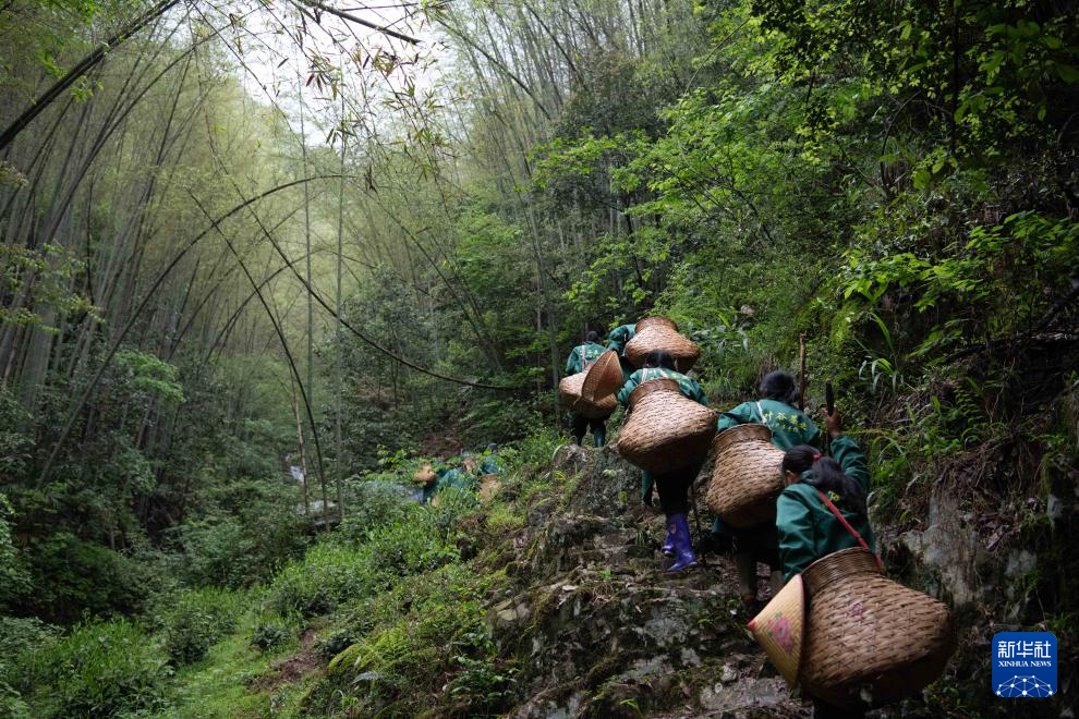 4月24日早晨,在黄山市黄山区新明乡猴坑村,采茶工徒步爬山,前往高山茶园采摘制作太平猴魁的鲜叶。
