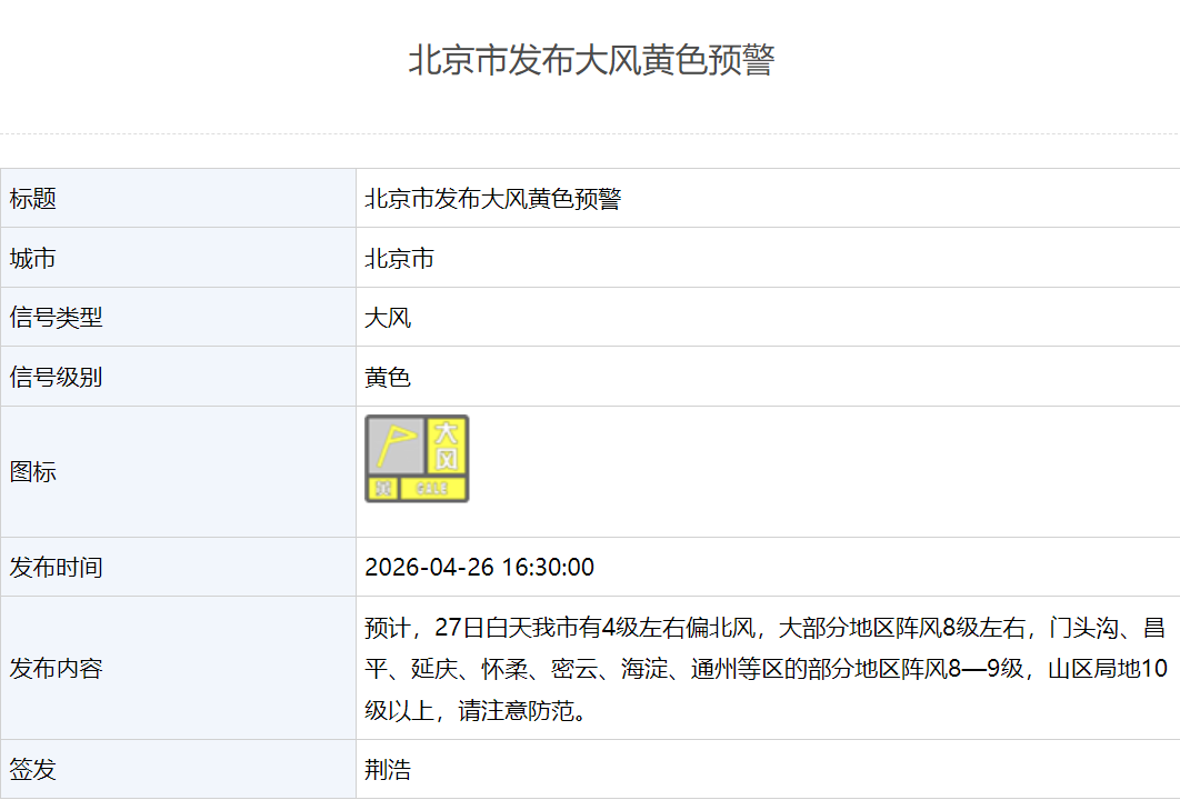 昨日16时30分,北京市发布大风黄色预警信号。预计,27日白天我市有4级左右偏北风,大部分地区阵风8级左右,门头沟、昌平、延庆、怀柔、密云、海淀、通州等区的部分地区阵风8—9级,山区局地10级以上,请注意防范。