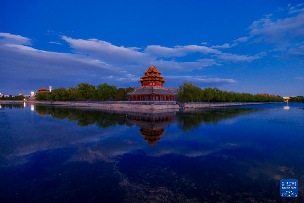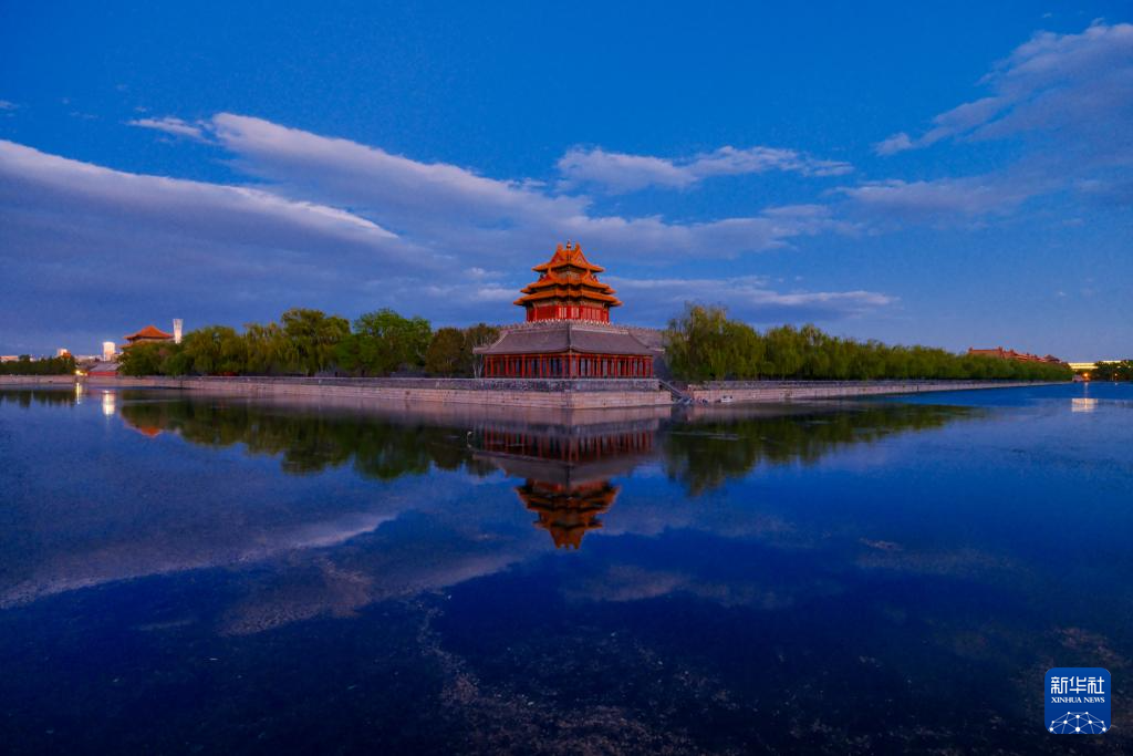 4月27日,暮色中的故宫角楼景色如画,引人入胜。